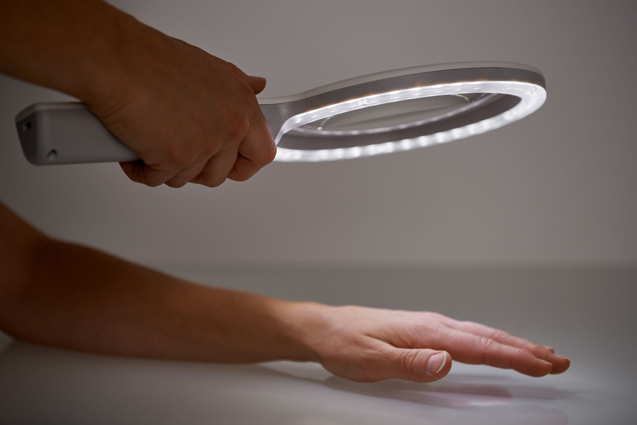 La nueva luminaria lupa Opticlux Hand es la ayuda perfecta para tareas visuales desafiantes. Esto es gracias a su gran campo de luz regulable en calidad de luz diurna, sus excelentes características de reproducción del color y su larga duración de la batería.